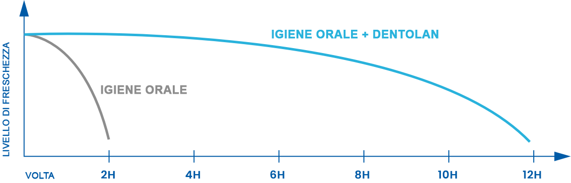 Come mostra il grafico, Dentolan in combinazione con l'igiene orale si traduce in un effetto freschezza molto più lungo rispetto alla sola igiene orale.